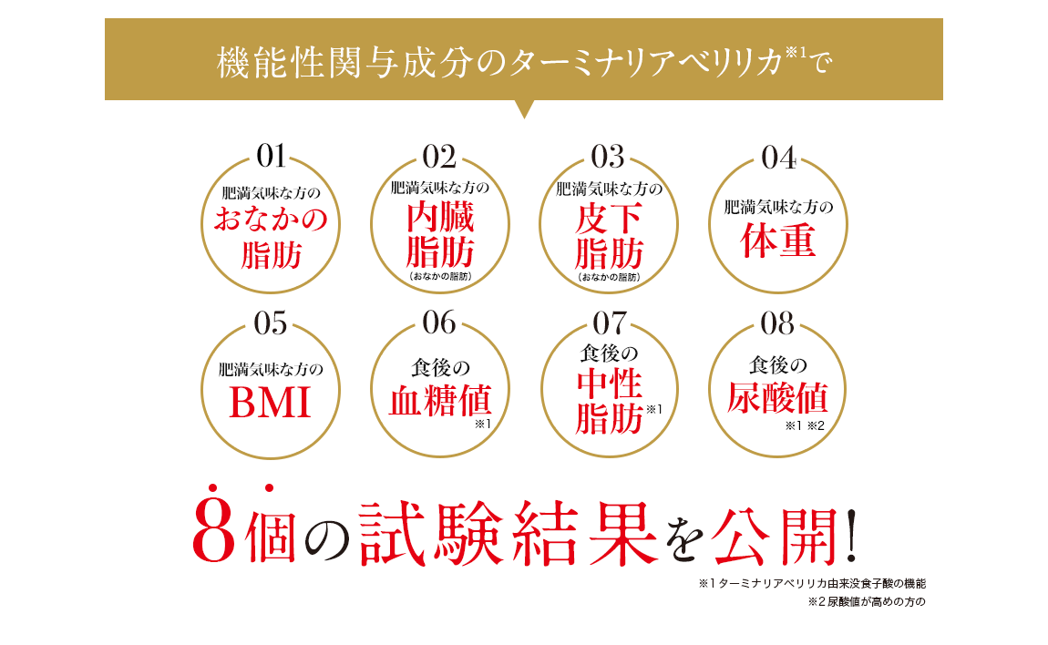 ①本品の継続摂取によりBMIが高めの方におなかの脂肪(体脂肪・内蔵皮下脂肪)・体重を減らすことで高めのBMIを低下させる ②本品の摂取により食事から摂取した脂肪の吸収を抑える