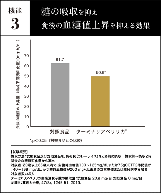 機能関与成分ターミナリアベリリカ由来没食子酸を配合! 糖の吸収抑制成分として注目されていて、試験でも実証されています。