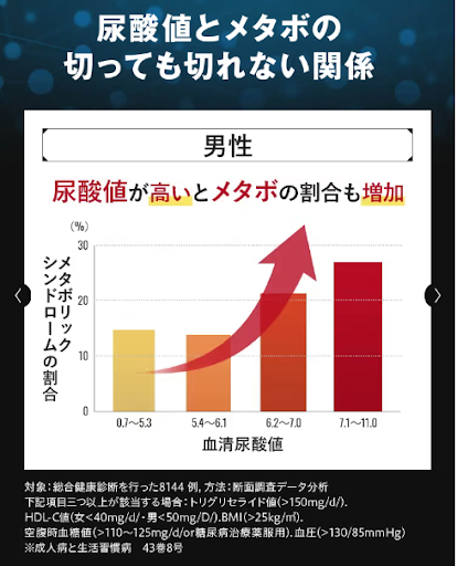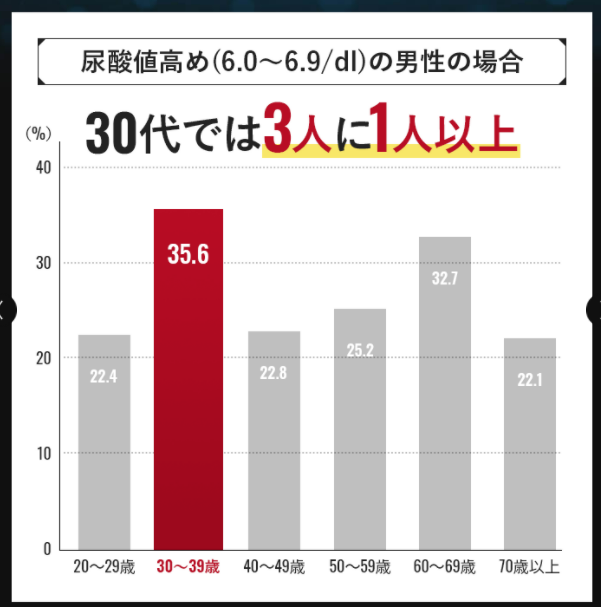 最近では30代男性の3人に1人は尿酸値が高めというデータもあり、若い人の中にも急増しています。