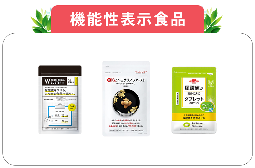 一般的なサプリは手軽さはありますが、効果が証明されてないため、高めの尿酸値効果がきちんと検証されている成分が配合されている機能性表示食品を必ず選びましょう。